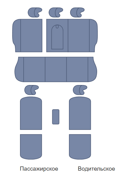 Состав: Передние спинки - 2, передние сиденья - 2, задняя спинка большая - 1, задняя спинка малая - 1, заднее сиденье сплошное - 1, подлокотник задний - 1, подлокотник передний - 1, подголовники передние - 2, подголовники задние - 3.